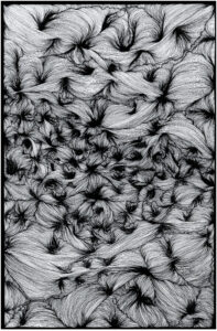 L’existence dans sa plus simple représentation. L’existence, ou son essence, mise en forme par des lignes dans tous les états : fines ; épaisses, ordonnées ou chaotiques, infinies et entrecoupées, tortueuses ou torturées. Elles symbolisent les liens qui unissent tout être, elles capturent dans des formes géométriques des moments de vie tantôt légers, tantôt lourds mais toujours plein de sens.
